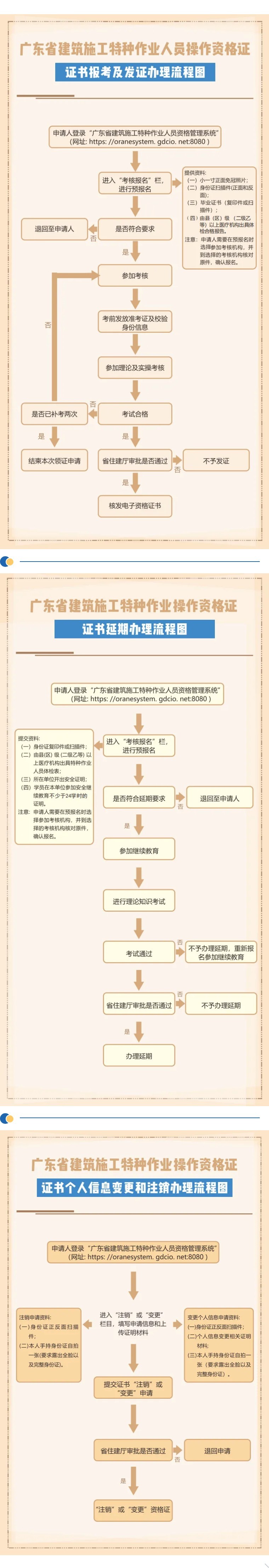 请通过电脑浏览器访问“广东省建筑施工特种作业人员资格管理系统”(网址:https://cranesystem.gdcic.net:8080/),进行办理广东省建筑施工特种作业操作资格证的报考、证书延期、个人信息变更及证书注销等业务,具体办理流程如下。