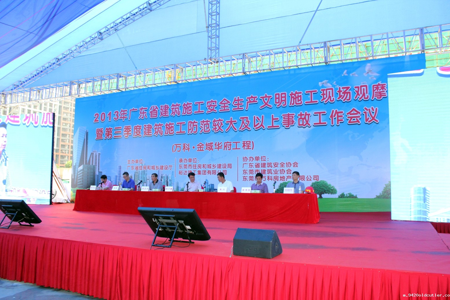 会上,东莞市住房和城乡建设局局长朱川致欢迎辞,观摩会现场万科金域华府工程施工单位裕达建工集团有限公司董事长宁永杰作创建筑安全生产文明施工示范工地经验发言,省住房和城乡建设厅党组成员、总工程师陈天翼在会上讲话,对2013年全省房屋市政工程质量安全管理暨第三季度建筑施工防范较大及以上事故工作进行部署。