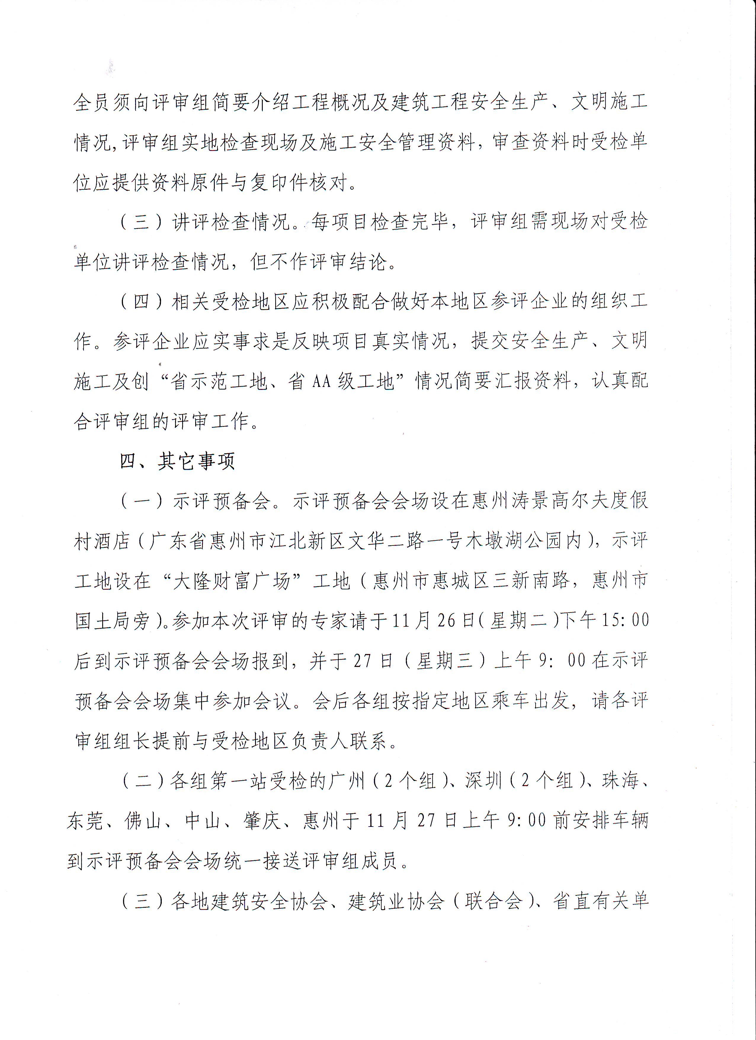 (四)相关受检地区应积极配合做好本地区参评企业的组织工作。参评企业应实事求是反映项目真实情况,提交安全生产、文明施工及创“省示范工地、省AA级工地”情况简要汇报资料,认真配合评审组的评审工作。