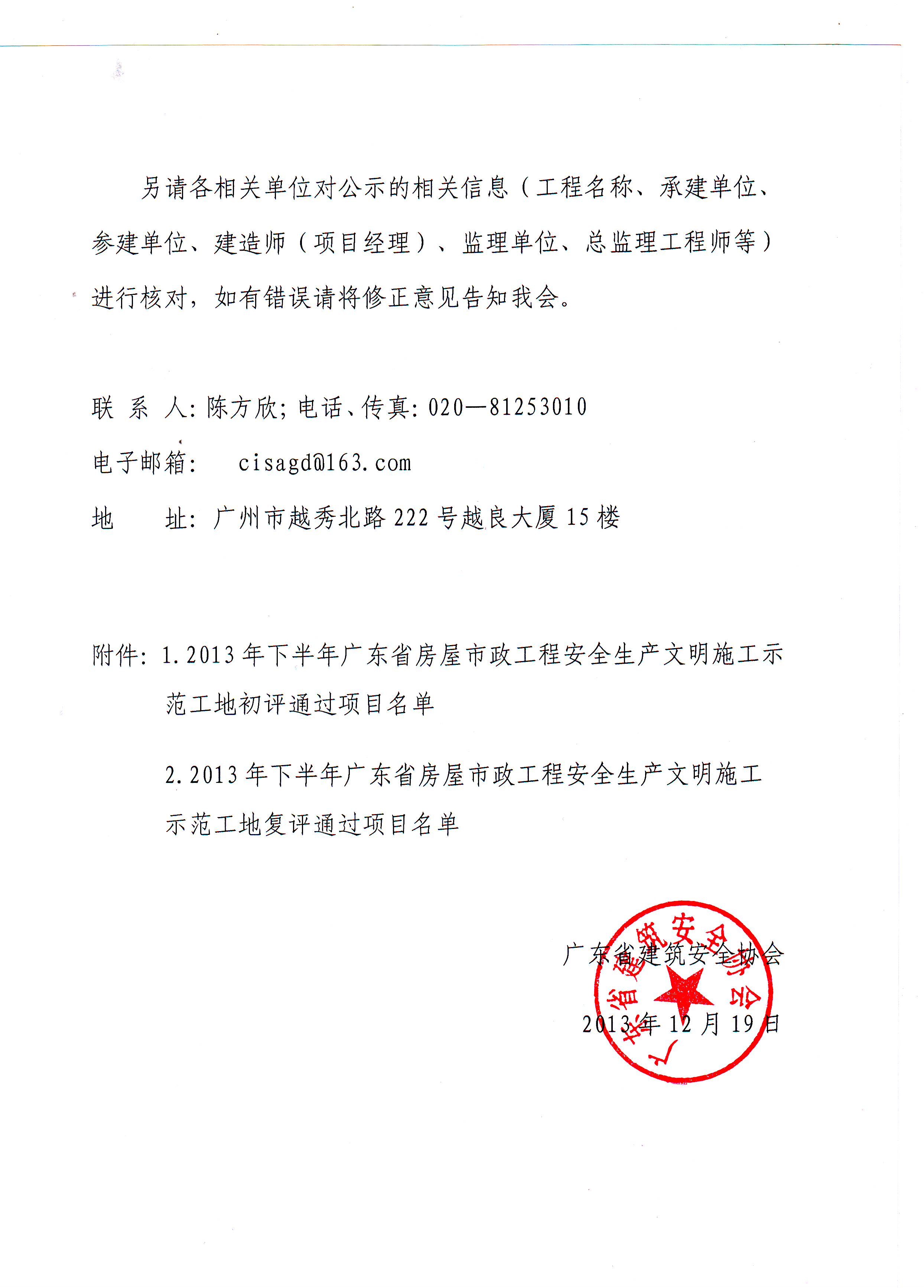 2.2013年下半年广东省房屋市政工程安全生产文明施工示范工地复评通过项目名单