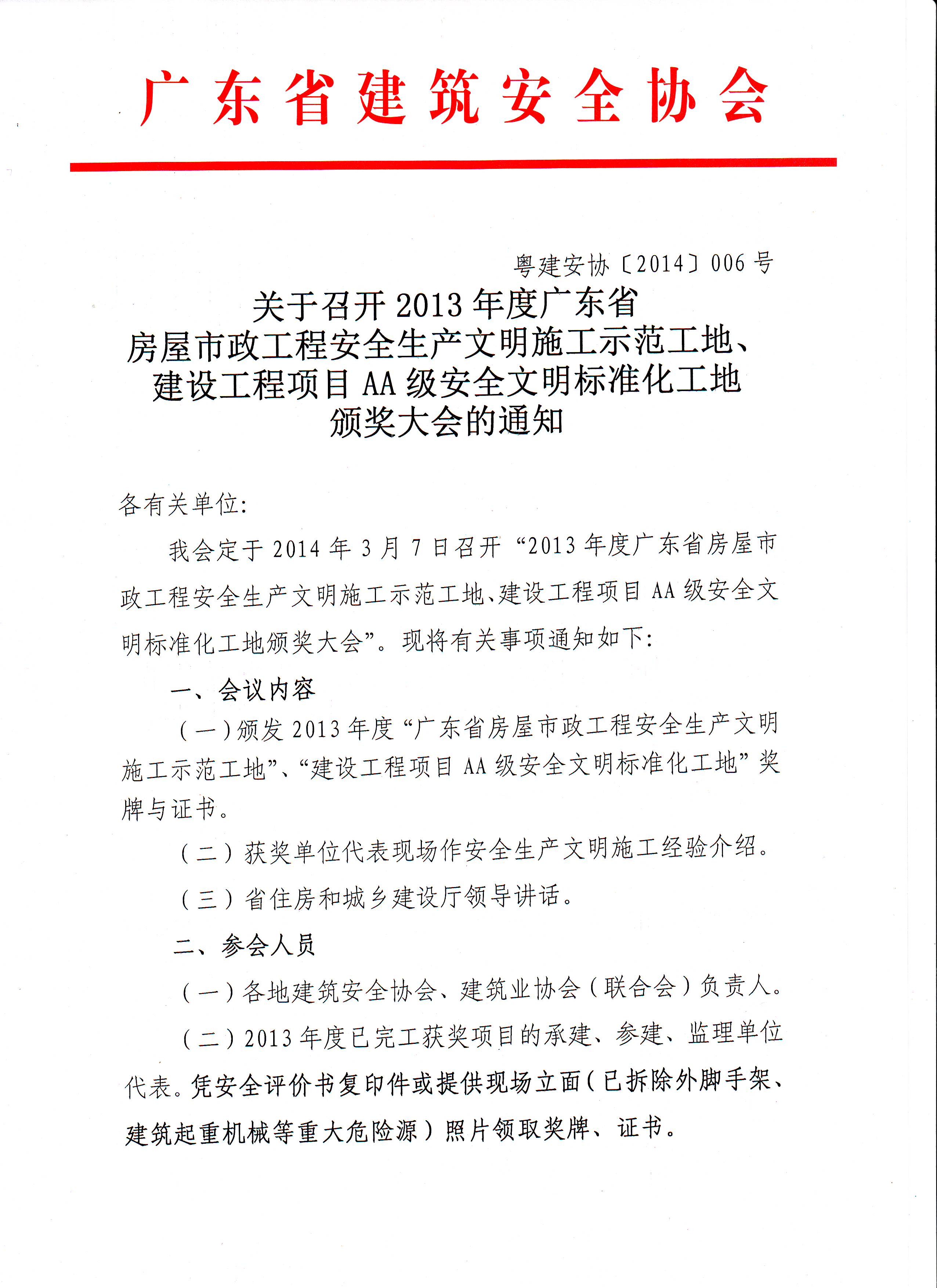 我会定于2014年3月7日召开“2013年度广东省房屋市政工程安全生产文明施工示范工地、建设工程项目AA级安全文明标准化工地颁奖大会”。现将有关事项通知如下: