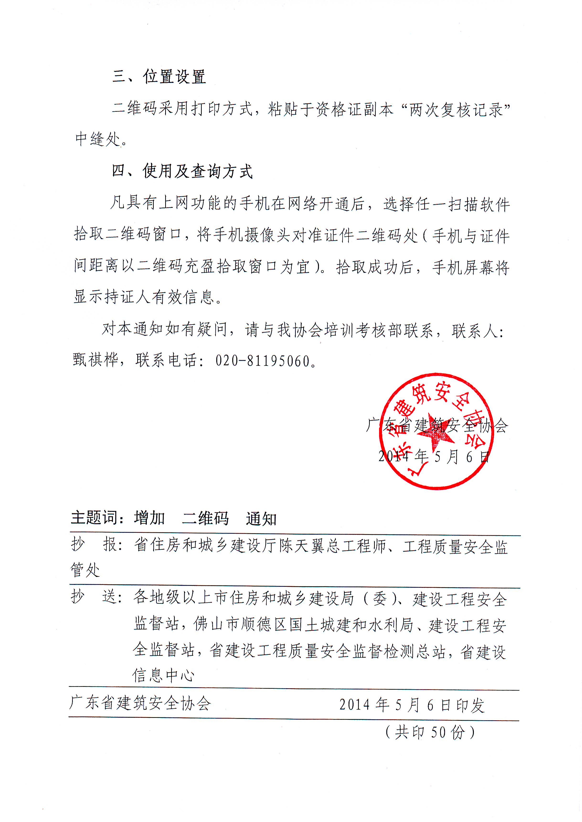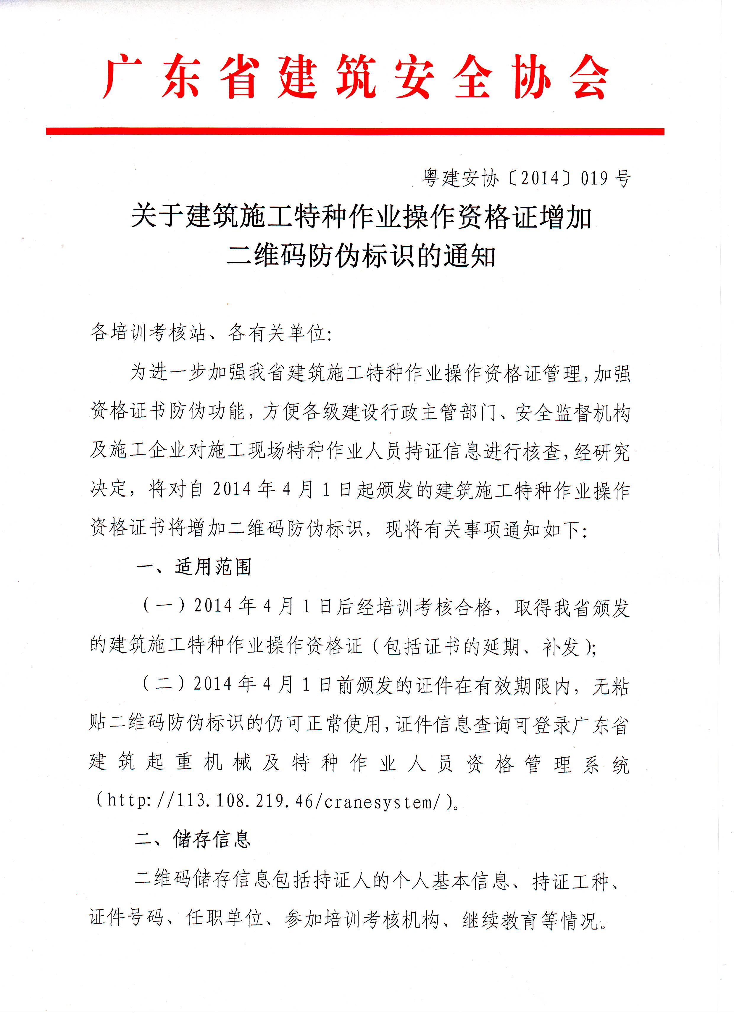 粤建安协〔2014〕019号 关于建筑施工特种作业操作资格证增加二维码防伪标识的通知