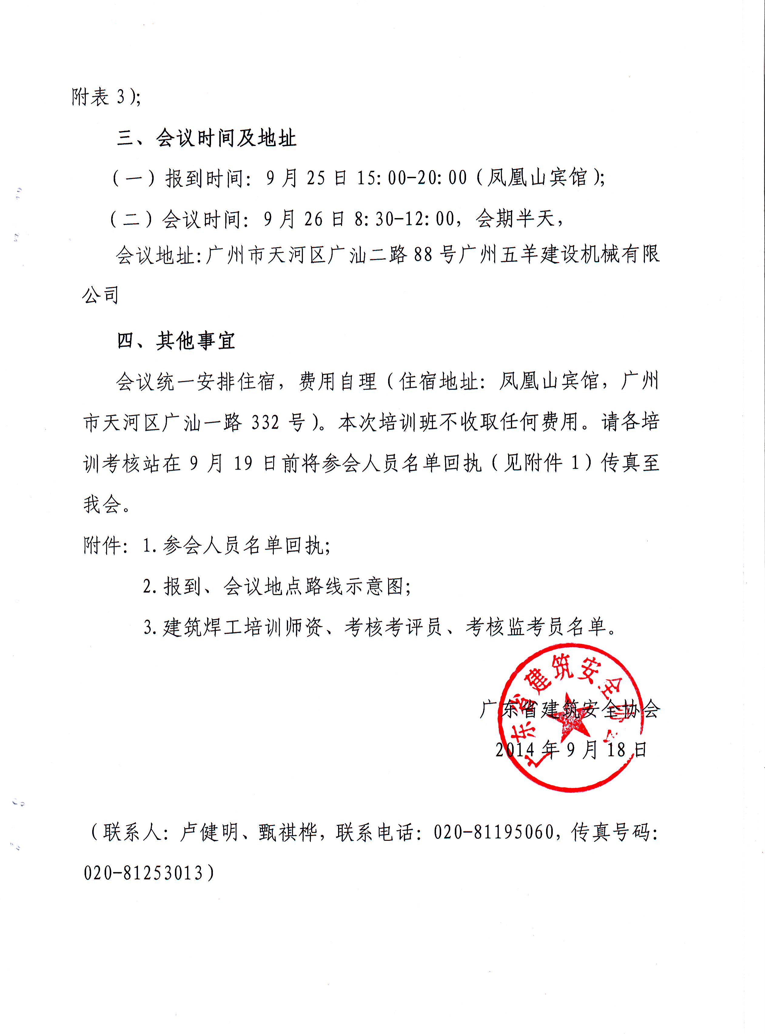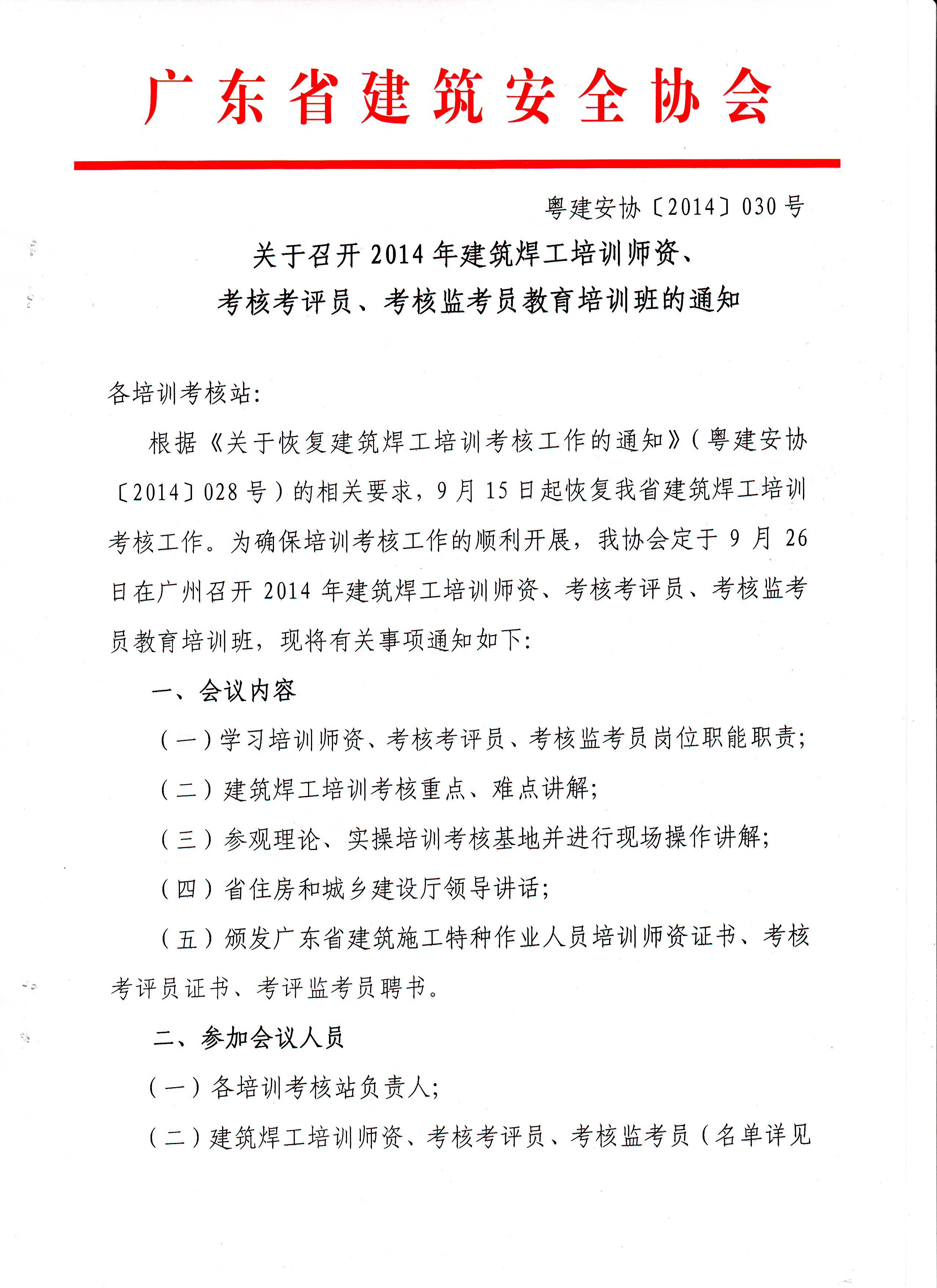 粤建安协〔2014〕030号关于召开2014年建筑焊工培训师资、考核考评员、考核监考员教育培训班的通知