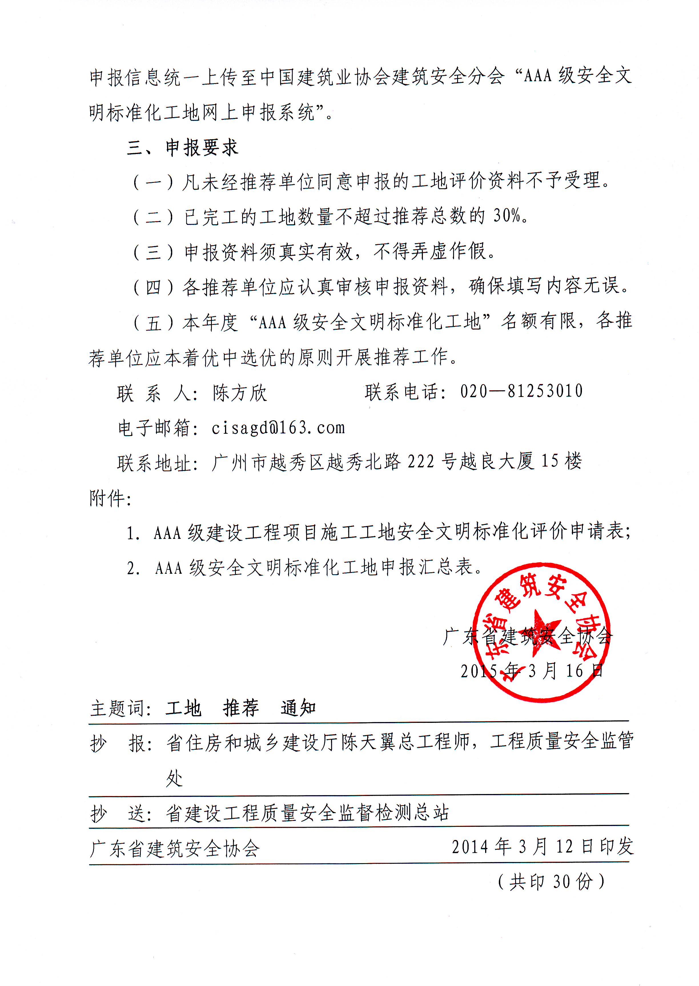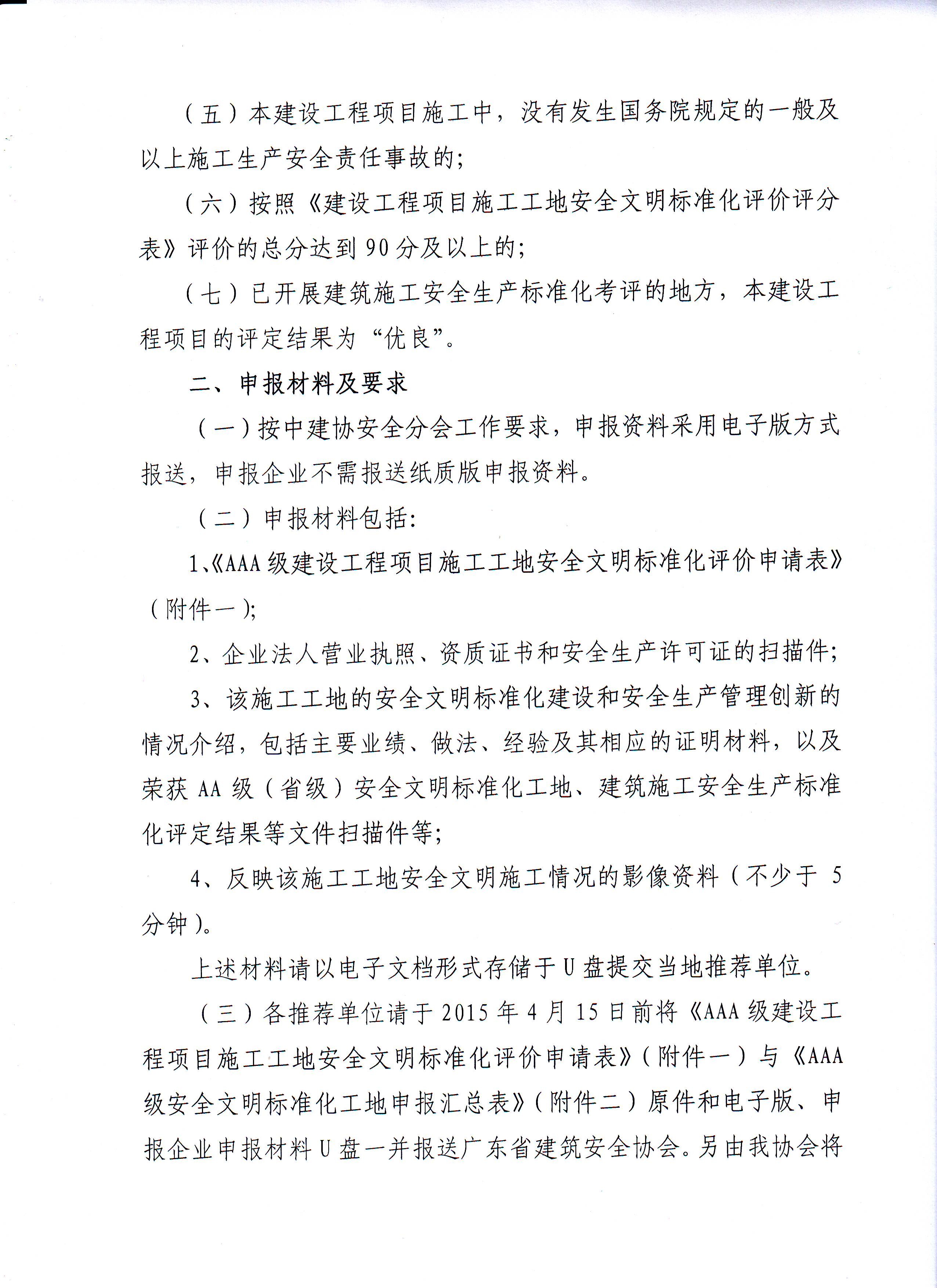 (三)各推荐单位请于2015年4月15日前将《AAA级建设工程项目施工工地安全文明标准化评价申请表》(附件一)与《AAA级安全文明标准化工地申报汇总表》(附件二)原件和电子版、申报企业申报材料U盘一并报送新利首页。另由我协会将申报信息统一上传至中国建筑业协会建筑安全分会“AAA级安全文明标准化工地网上申报系统”。