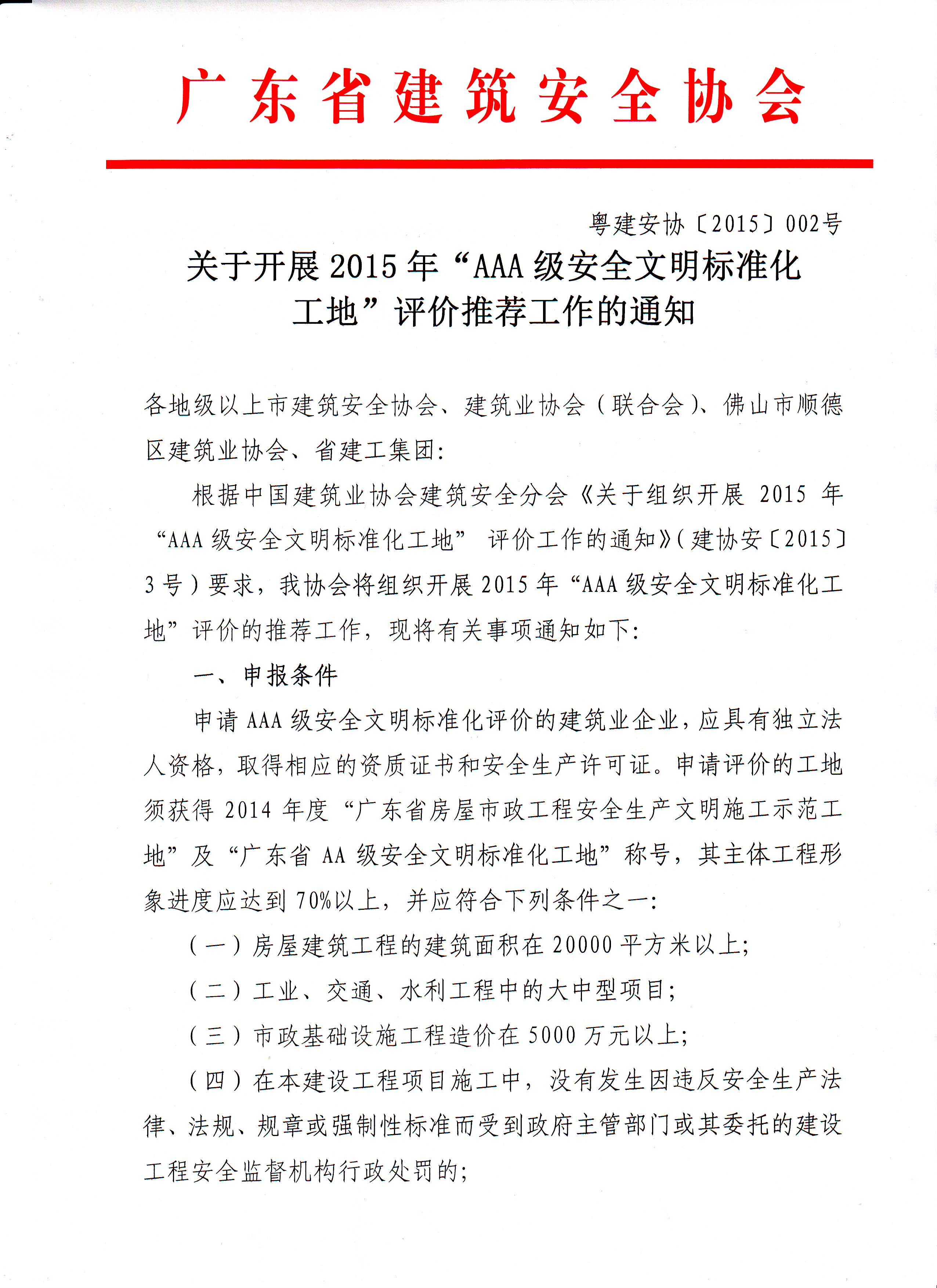 粤建安协〔2015〕002号关于开展2015年“AAA级安全文明标准化工地”评价推荐工作的通知