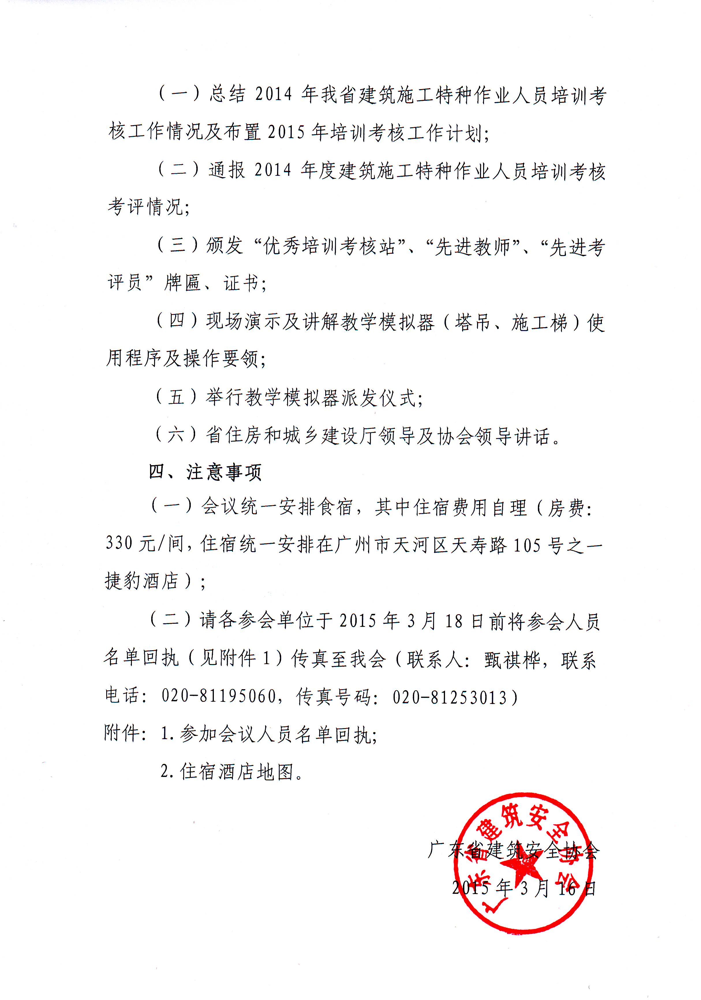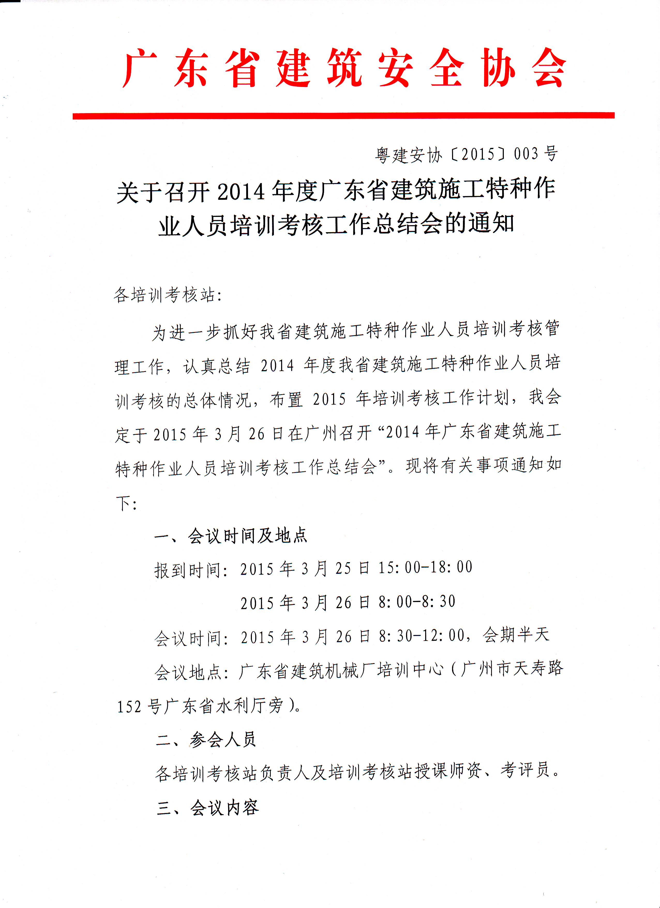 粤建安协〔2015〕003号关于召开2014年度广东省建筑施工特种作业人员培训考核工作总结会的通知