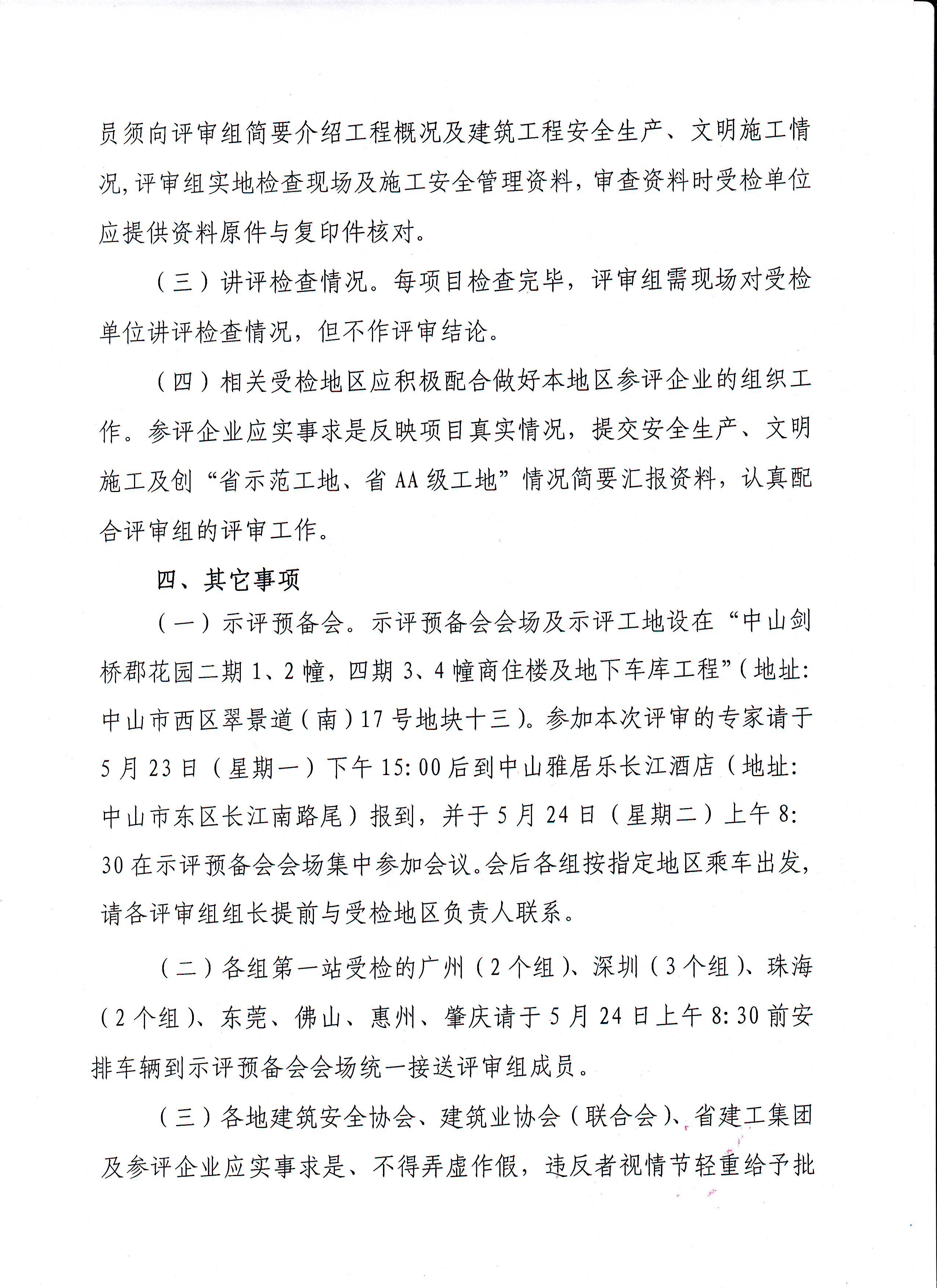 (四)相关受检地区应积极配合做好本地区参评企业的组织工作。参评企业应实事求是反映项目真实情况,提交安全生产、文明施工及创“省示范工地、省AA级工地”情况简要汇报资料,认真配合评审组的评审工作。